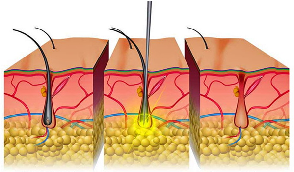 Eine sehr feine Metallsonde (Stahl oder Gold) wird vorsichtig in den Haarkanal eingeführt und ein kurzer Stromimpuls wird abgegeben, so dass die Stammzellen (Haarwachstumszellen) irreversibel zerstört werden.