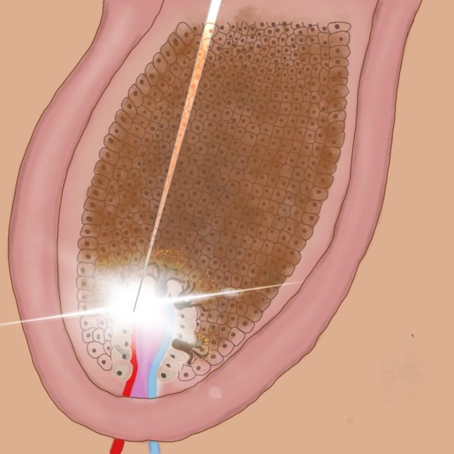 Durch einen Stromimpuls werden gezielt die Stammzellen in der Anagenphase sofort zerstört (denaturiert).