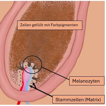 Unsere Haare bestehen aus vielen Zellen. Die Matrixzellen teilen sich und schieben neue Zellen nach oben. Die hochgeschobene Zellen werden mit Pigmenten aus Melanozyten angereichert. Die Haarfarbe unterscheidet sich je nach eingelagertem Pigment.