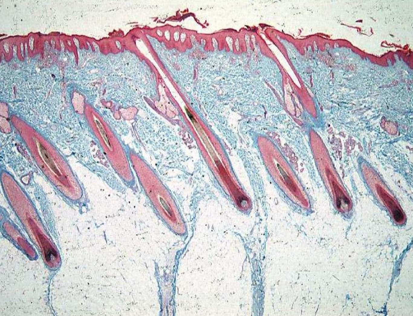 Haut unter dem Mikroskop. Aktive und inaktive Haarfollikel sind sichtbar.