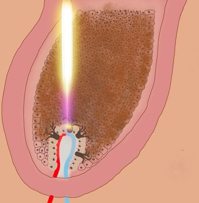 Nur bestimmte Laserwelle (Wellenlänge) kann von Melanozyten absorbiert und in Wärme umgewandelt.